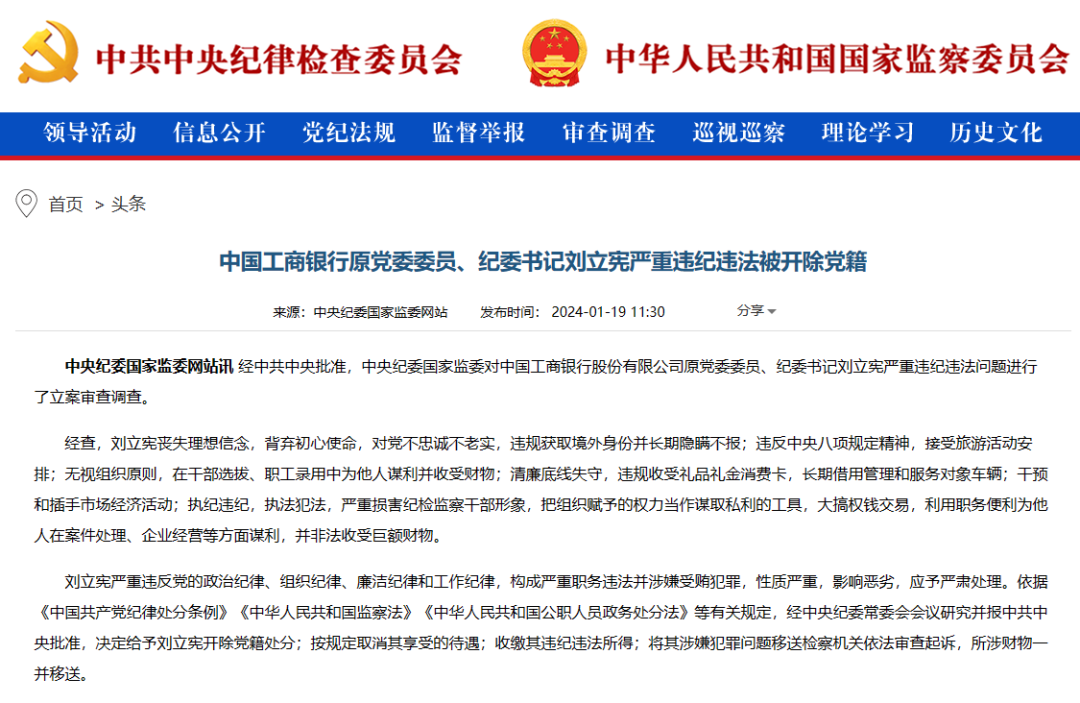 1月19日中午,中央纪委国家监委官网通报:中国工商银行原党委委员、纪委书记刘立宪严重违纪违法被开除党籍。