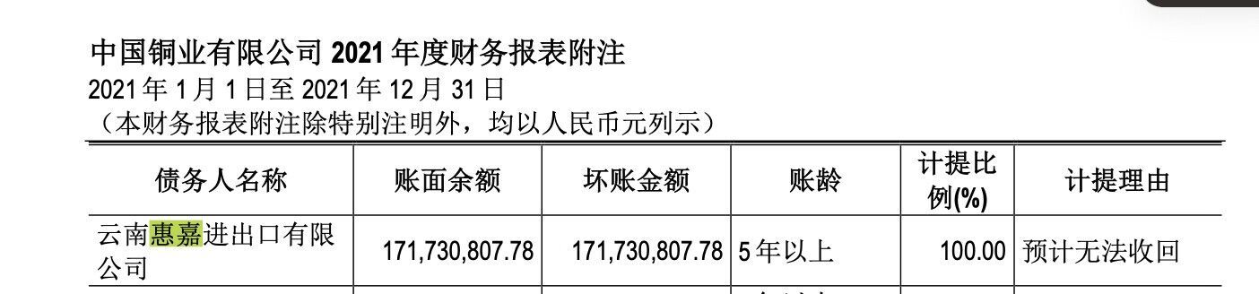另外,除了因诉讼导致的执行金额,云南惠嘉也出现在一些企业的应收款方中。例如,在中国铜业有限公司2021年年度报告中,截至2021年末,云南惠嘉的应收款账面余额为1.72亿元,全额计提坏账准备,账龄5年以上,理由是预计无法收回。
