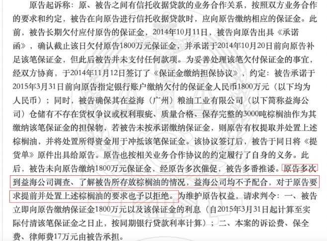 值得注意的是,2014年,由于长期欠付中国建设银行股份有限公司昆明城西支行的保证金,云南惠嘉曾在协议中,将广州益海仓储的3000吨棕榈油作为其缴纳该笔保证金的担保物,不过根据原告(中国建设银行股份有限公司昆明城西支行)方的说法,广州益海不配合原告调查了解棕榈油的存储情况。