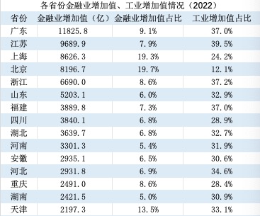统计数据显示,2022年广东金融业增加值达到1.18万亿,是31个省份中唯一一个超过万亿的省份。从占比看,广东、浙江、江苏、四川、河南金融业增加值占GDP比重分别为9.1%、8.6%、7.9%、6.8%、5.4%,其中前两者高于全国平均水平(8%),后三者低于全国平均水平。
